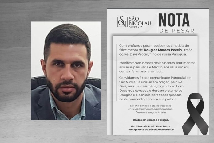 Com profundo pesar recebemos a noticia do falecimento de Douglas Moraes Peccin (Douglas era CEO da MP AGRO, empresa sediada em Ibaté), irmão do Pe. Davi Peccin, filho de nossa Paróquia.