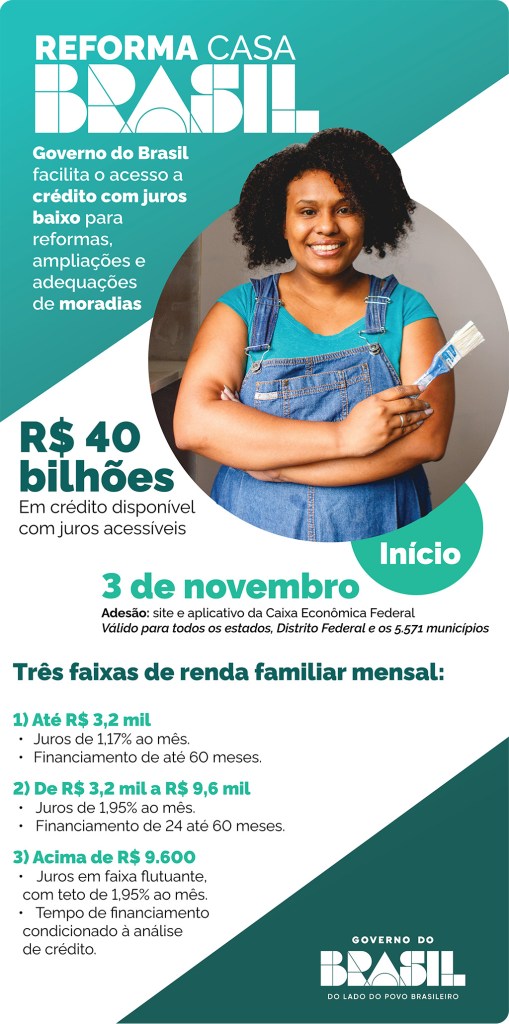 O Governo do Brasil lançou nesta segunda-feira, o Reforma Casa Brasil, um novo programa habitacional para facilitar o acesso a crédito com juros baixo para reformas, ampliações e adequações de moradias em todo o país. São R$ 40 bilhões disponíveis para ações como uma troca de piso, um ajuste no telhado, ampliar a varanda, acrescentar um quarto novo ou construir a cozinha dos sonhos. O objetivo é assegurar o direito à moradia digna, promover inclusão social e urbana e movimentar a economia, com geração de emprego e renda na cadeia da construção civil. Confira abaixo como o programa vai funcionar.