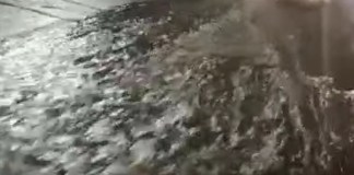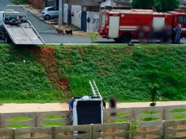 Caminhonete estacionada, perde o freio, invade córrego e fica pendurada