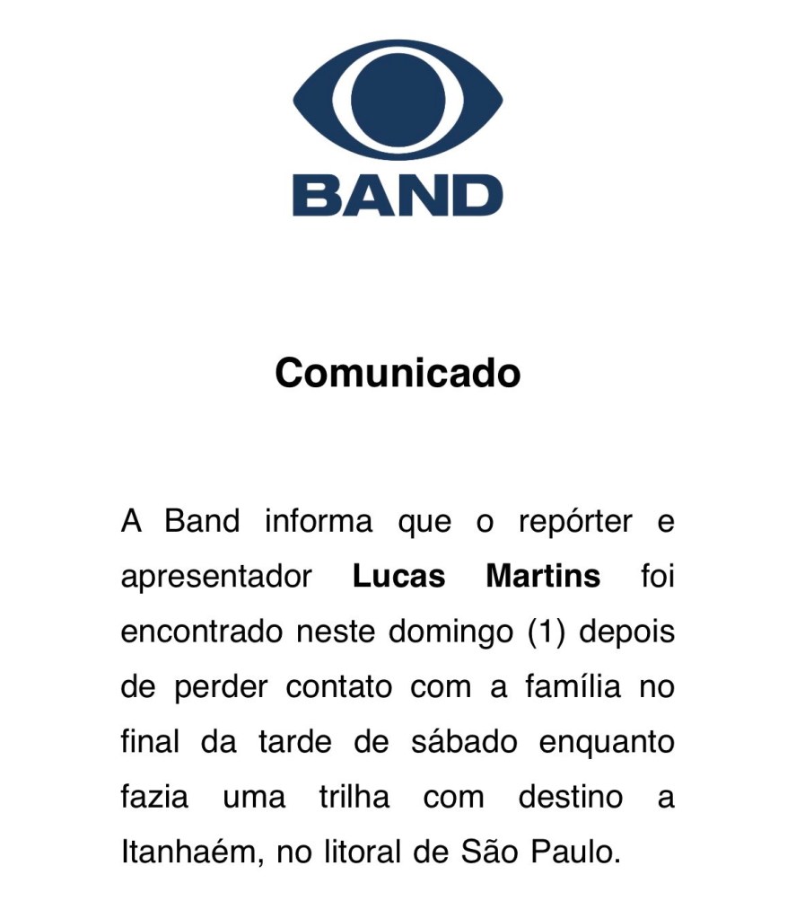 A emissora Band divulgou neste domingo (1º) que o repórter e apresentador Lucas Martins foi localizado após perder contato com a família na tarde de sábado, enquanto realizava uma trilha em direção a Itanhaém, no litoral paulista.