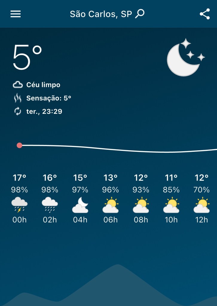 No final da noite desta terça-feira, 24 de junho, dia de São João, São Carlos enfrenta uma intensa onda de frio. Às 23h30, os termômetros da cidade já marcavam 5°C, com previsão de queda ainda maior durante a madrugada.