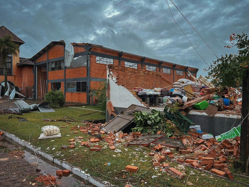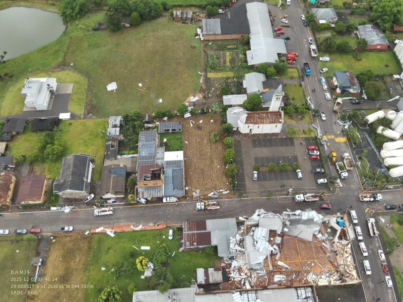 As imagens aéreas dos danos na comunidade de Alfredo Chaves, interior de Flores da Cunha, mostram que a localidade foi atingida por um tornado. O padrão de danos indica que os destroços foram jogados em diferentes direções, o que caracteriza o fenômeno.