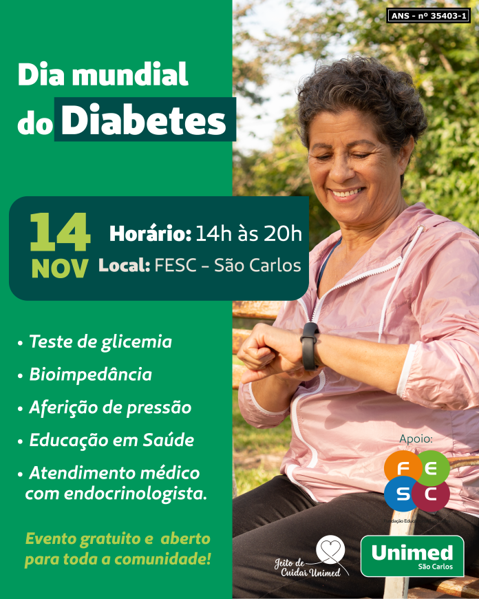 No dia 14 de novembro, das 14h às 20h, a Unimed São Carlos, em parceria com a FESC, convida a população para um evento especial de prevenção ao Diabetes. Aberta ao público e totalmente gratuita, a ação tem como propósito ajudar cada pessoa a entender melhor os riscos da doença e mostrar que cuidar da saúde pode ser mais simples do que parece.
