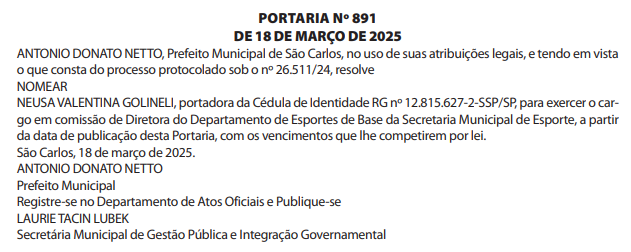 No Diário Oficial desta quarta, 19, o prefeito Netto Donato nomeou dois ex-vereadores para cargos de confiança na Prefeitura de São Carlos. O ex-vereador Moisés Lazarine foi nomeado Diretor do Departamento de Educação para o Trânsito da Secretaria Municipal de Segurança Pública e Mobilidade Urbana.